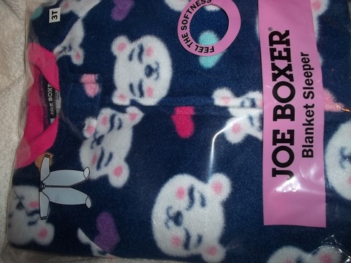 Girl's Dark Blue Blanket Sleeper with Polar Bears by Joe Boxer is size 3T ( 38" tall and 30-33 lbs). Soft, warm, easy care flame resistant fleece. Knit collar and cuffs for a comfortable fit. Full length front zipper for easy changing. Non-skid, breathable soles. 100% polyester. NEW in Package!!!