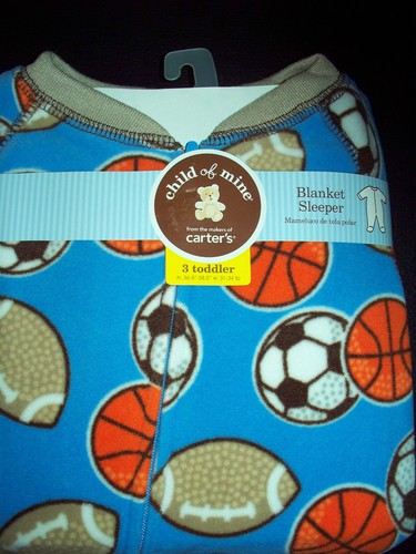 You are bidding on a boy's Carter's Child of Mine blanket sleeper in Size 3T. This Size 3T fits boys weighing 31 to 34 pounds and heights of 36 1/2 to 38 1/2 inches tall. Sleeper is 100% polyester. Zip up the front for easier changing. Non-skid soles to prevent child from slipping. Nice quality item from Carters. Sleeper is blue with different kinds of balls on it. Comes from a smoke free home. Thanks for looking.