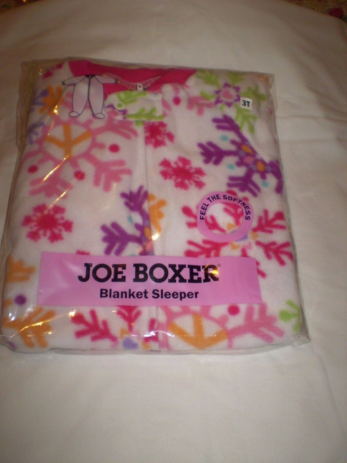 We have a Joe Boxer brand Blanket Sleeper available in Size 3T. It has a snowflake design done in pink, purple, pumpkin and lime green on a white background. The rib knit trim at neckline and sleeves is dark pink. This sleeper is made of soft and warm flame resistant fleece. It has a full length front zipper for easy changing and non-skid, breathable soles. The size chart on the package states a 3T fits 38" height and 30-33 lbs. This item is unused, new in PVC free package. Comes from a smoke-free home. Please ask any questions before bidding. Shipping is $4.25 USPS First-Class Postage with tracking.